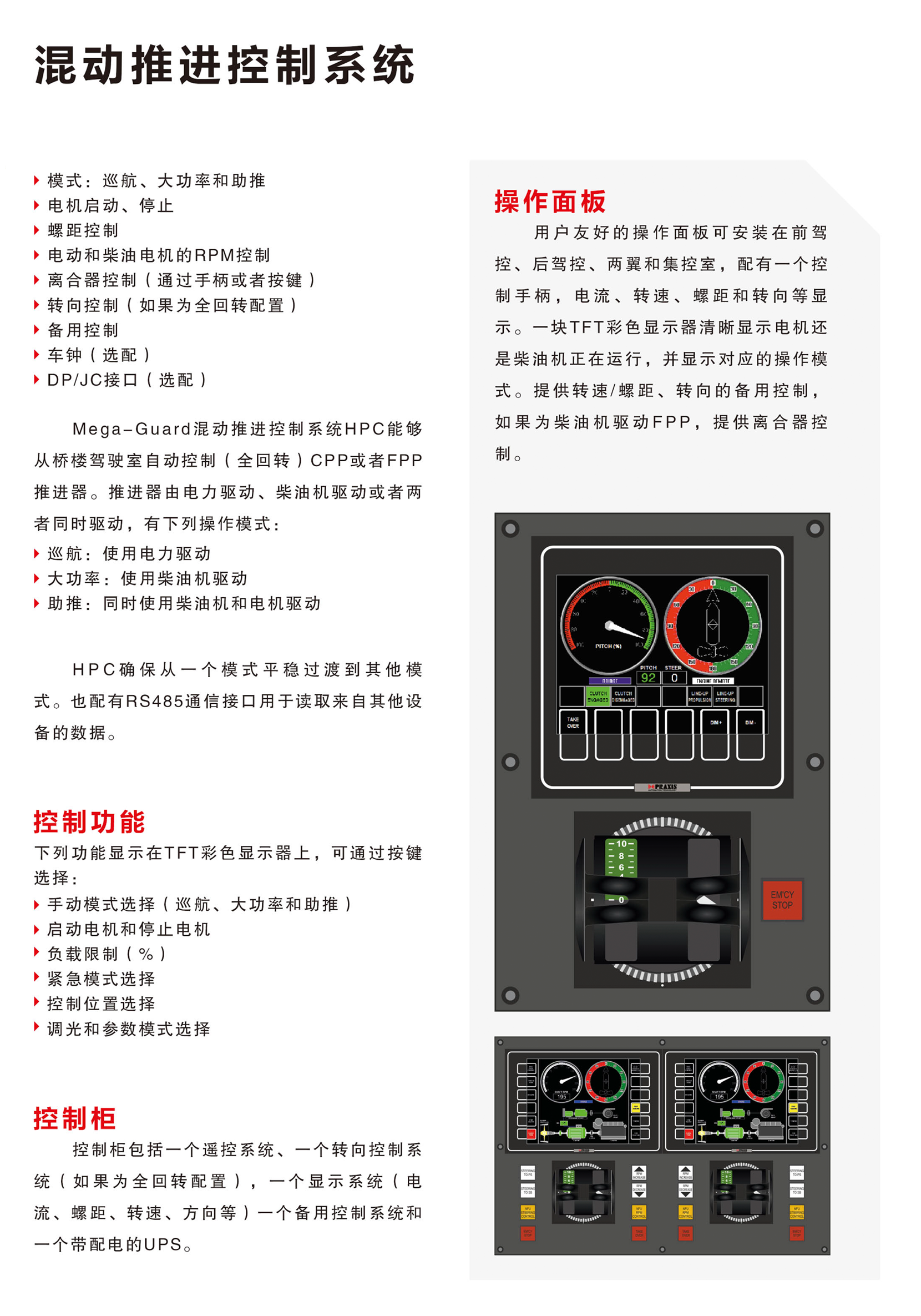 三種控制模式(電機驅動;柴油機驅動;同時使用電機和柴油機驅動);可從一個模式平穩過渡到其他模式;可控制螺距;可從駕駛室自動控制全回轉;用戶界面友好,易操作